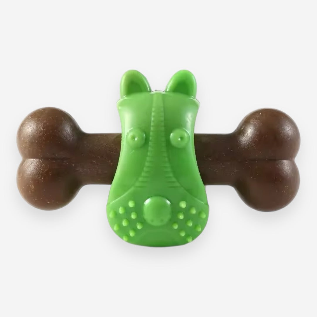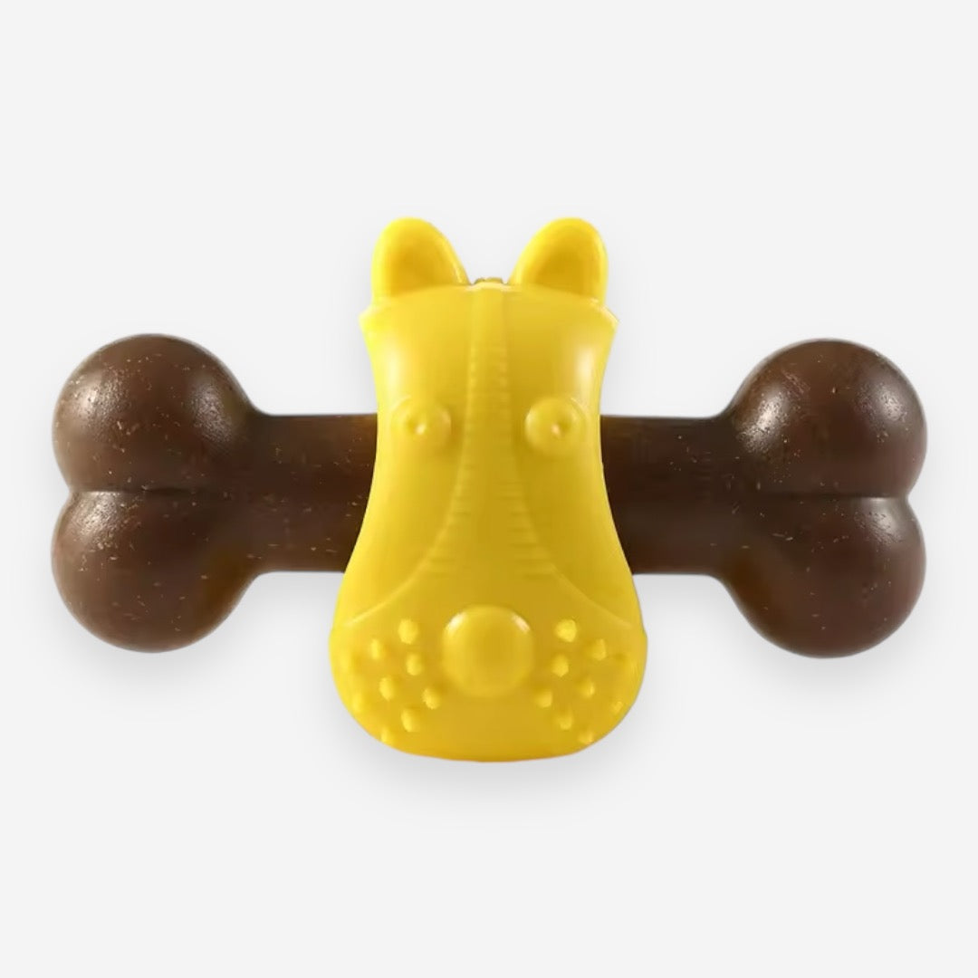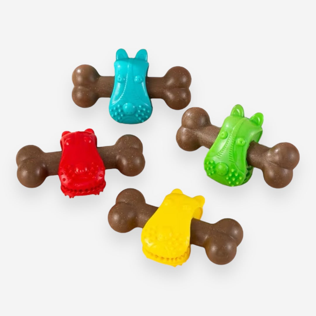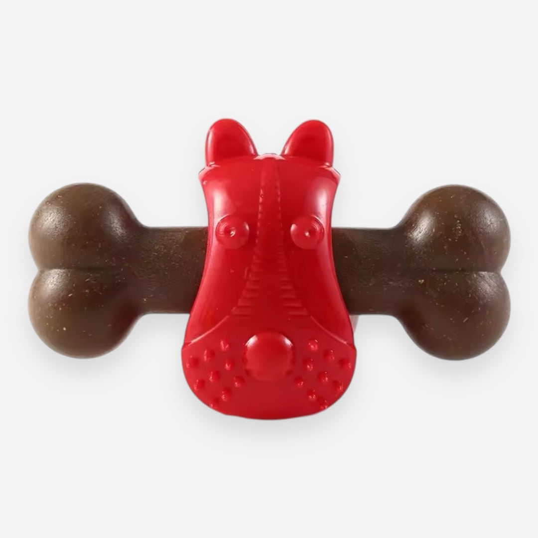 Tiene forma de hueso, un diseño clásico que atrae a muchos perros debido a su forma familiar. Fabricado con carnaza de animal secada, que es un material resistente y duradero. La carnaza esta tratada para mejorar su durabilidad. La textura es firme, proporcionando una masticación satisfactoria y ayudando a limpiar los dientes y encías mientras el perro juega.
