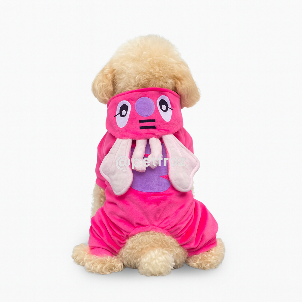 Enterizo rosa con diseño de Ángela de Lilo & Stich, que incluye detalles en relieve y orejitas suaves. Es cómodo, abrigador y perfecto para los peludos que aman destacar con un look tierno y original.