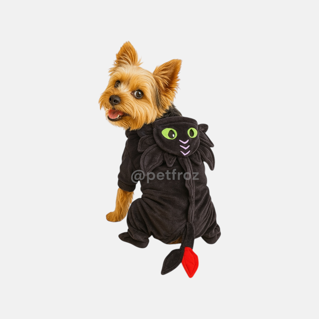 Difraz de Chimuelo, con capucha de ojos verdes brillantes y una cola con punta roja. Hecho de tela suave y cómoda, es perfecto para Halloween o para los peludos con un toque travieso.
