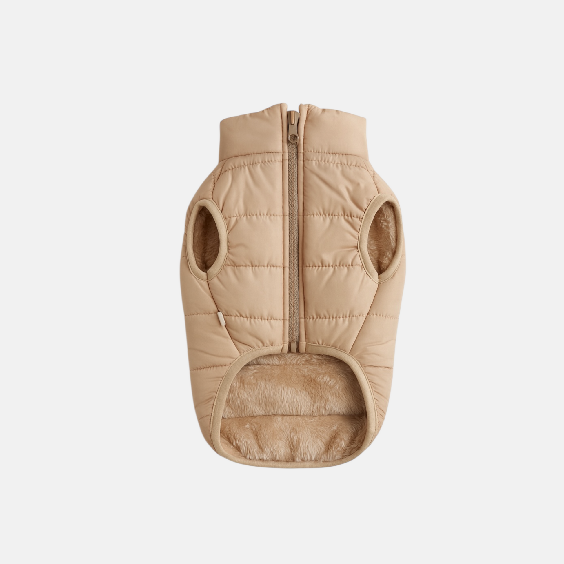 Chaleco acolchado beige, con cierre delantero y borde al tono. Es una prenda ligera, cálida y cómoda, ideal para mantener a tu mascota abrigada sin perder estilo. Perfecta para paseos en días frescos o para darle un toque elegante a su look diario.